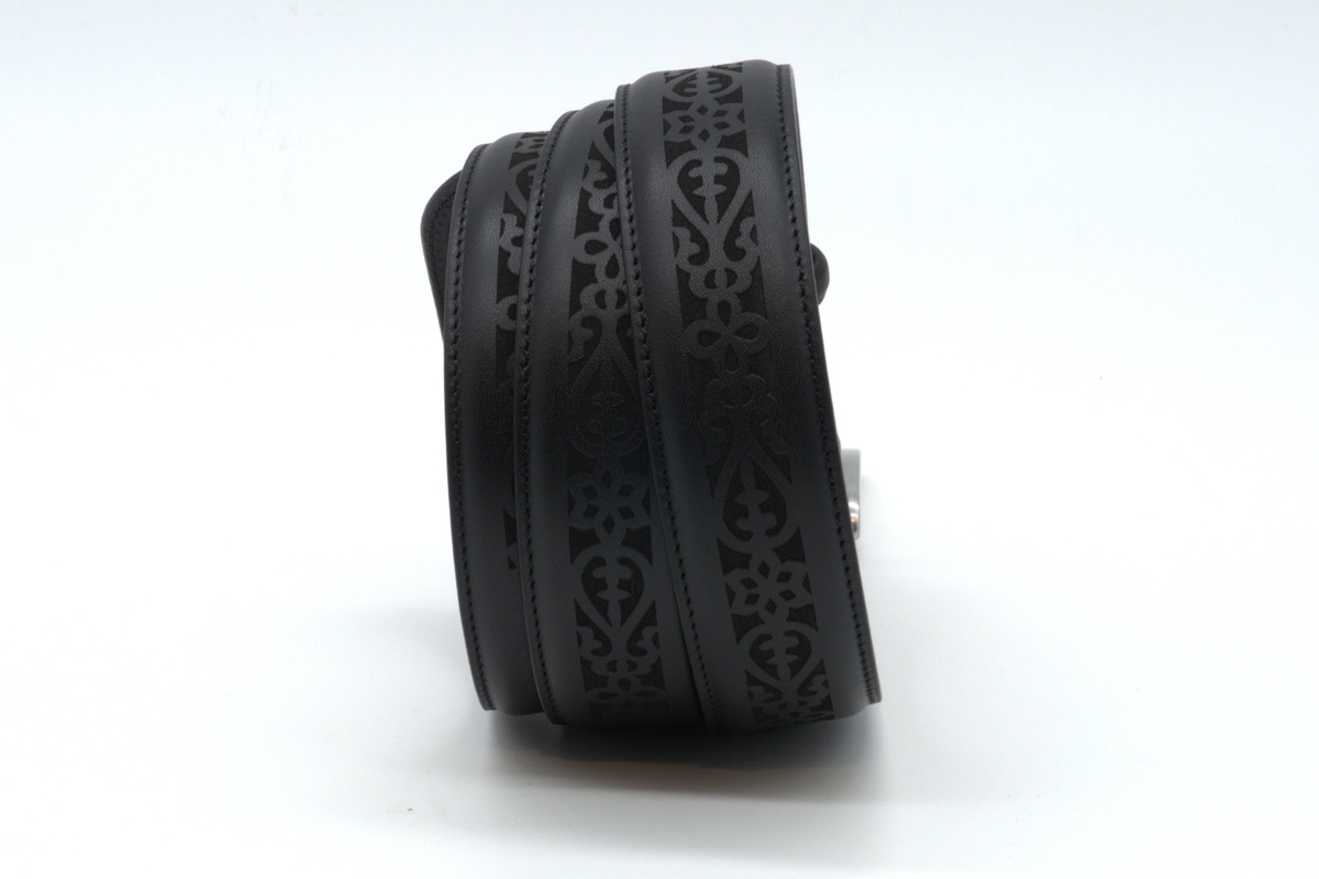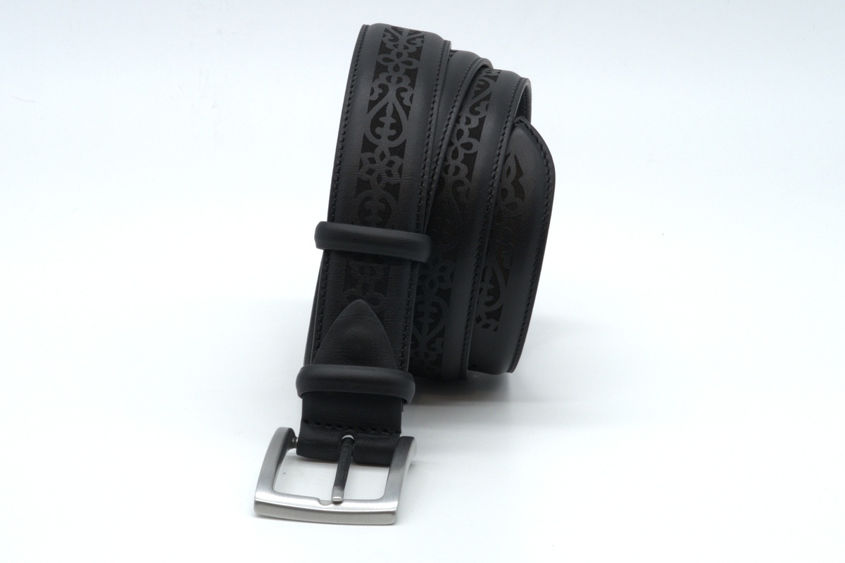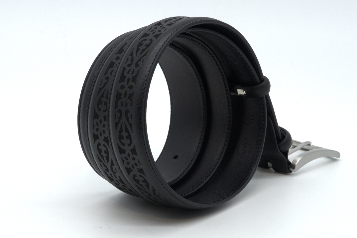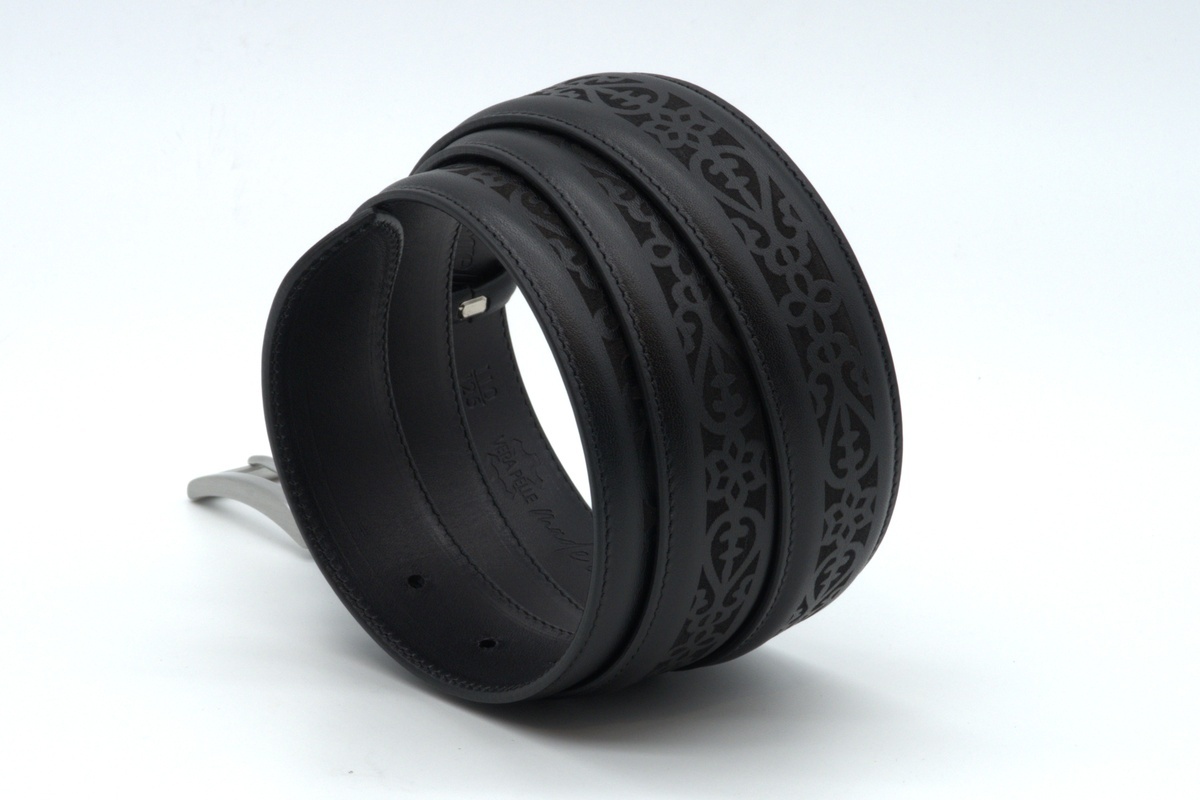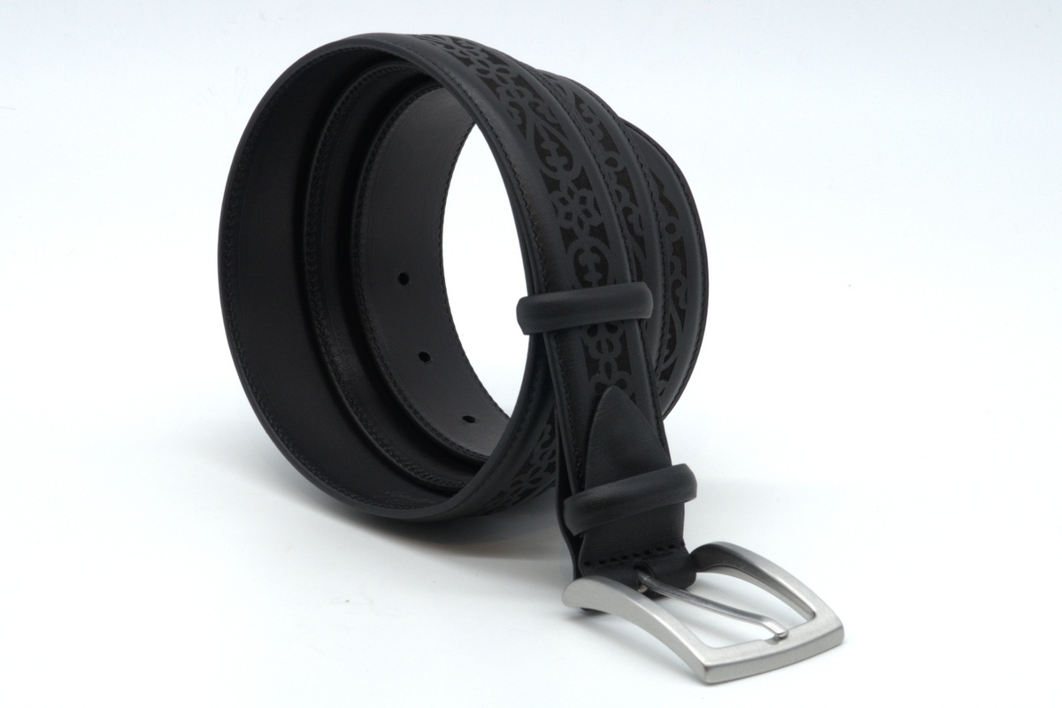 Cintura realizzata a mano in Sardegna in pelle nera con incisione, ispirata ai disegni tradizionali sardi dell’artigianato, design by Bagella.