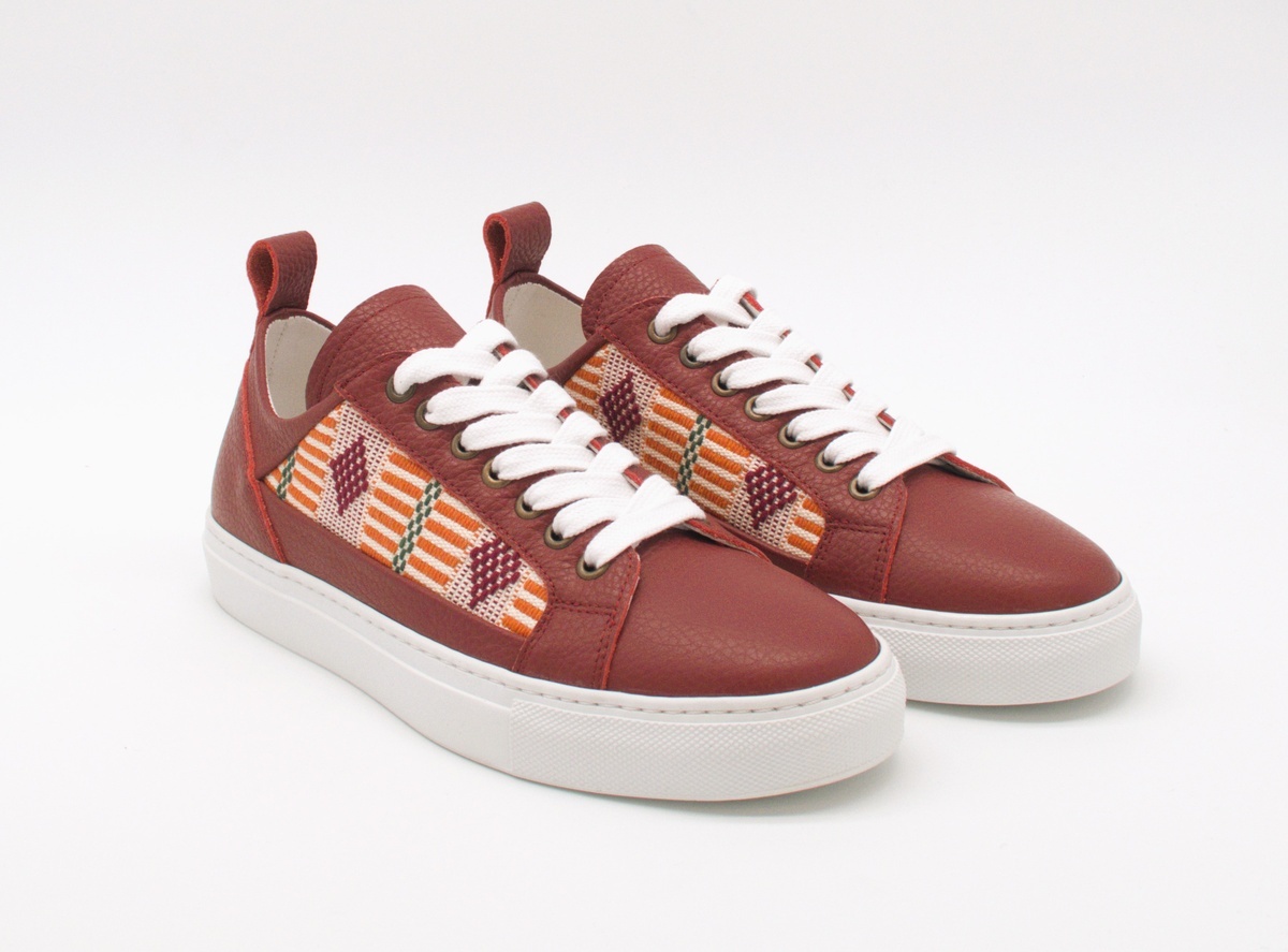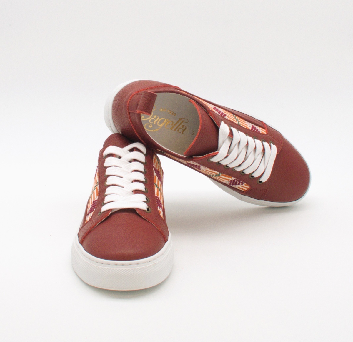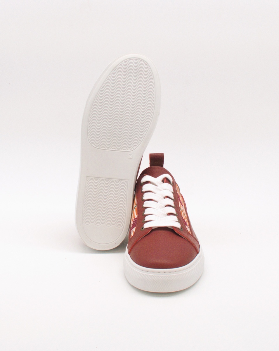 La nostra collezione di scarpe sarde Camineras si amplia con le nuove sneakers in stile sardo da uomo e da donna, a tiratura limitata. Realizzate artigianalmente in pelle di vitello naturale con effetto martellato. La suola è cucita alla tomaia, i suoi lacci sono in cotone rosso brillante o bianchi a contrasto con il pellame bordeaux, gli inserti sono in tessuto sardo realizzato al telaio manuale in Sardegna, con un motivo personalizzato Bagella. Un accessorio ispirato alla tradizione sarda, ma con un tocco di modernità ed innovazione che lo distinguono.